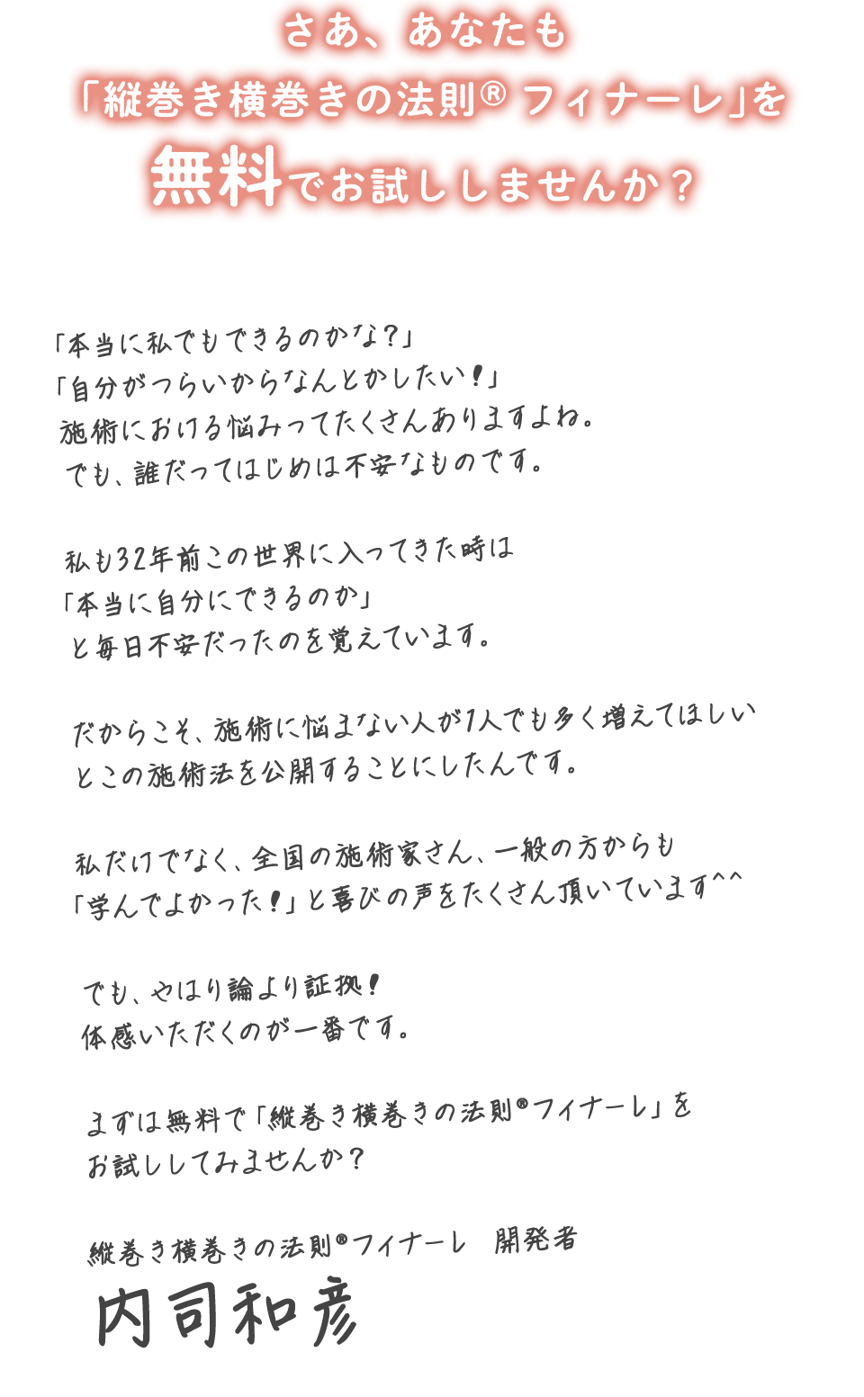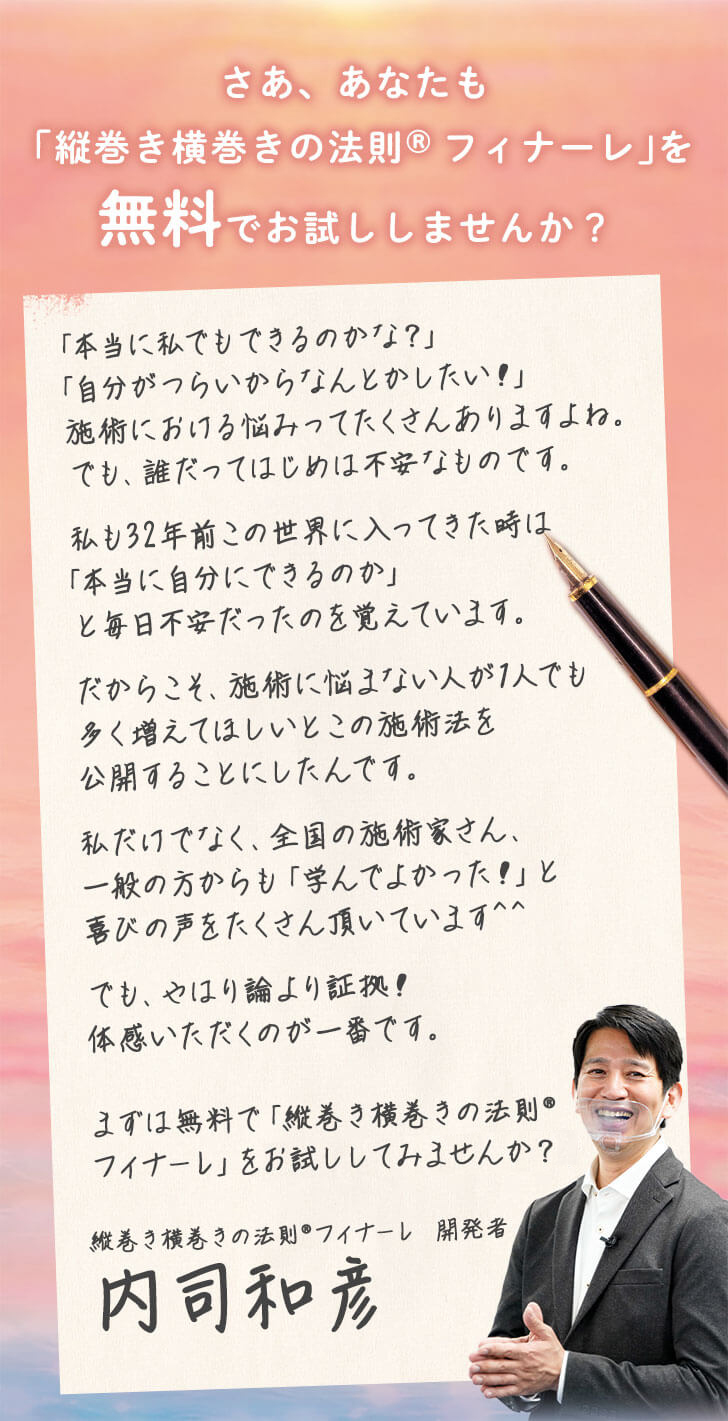 ご希望の方にのみ、「縦巻き横巻きの法則® フィナーレ」の全貌を公開した教材をお届けする予定です。 | 特別価格37,900円 (税込41,690円) ※オンライン 価格 |